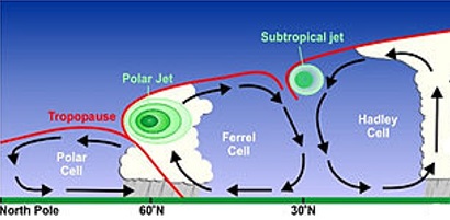 Also, because the earth is spinning while all this air circulation is going on, the flow of those circulating cells gets twisted and the combination of all this results in “the jet stream.” In fact there two “jets” in each hemisphere. These jets get pushed around from winter to summer.