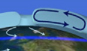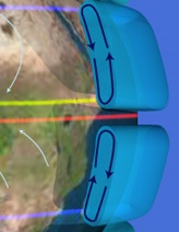 So now you can imagine a stack of three bands surrounding the earth north of the equator, and another three south of the equator. The equator-hugging bands are called Hadley cells. the Arctic and Antarctic skull-caps are called Polar cells, and the bands in the middle are called Mid-latitude or Ferrel cells.