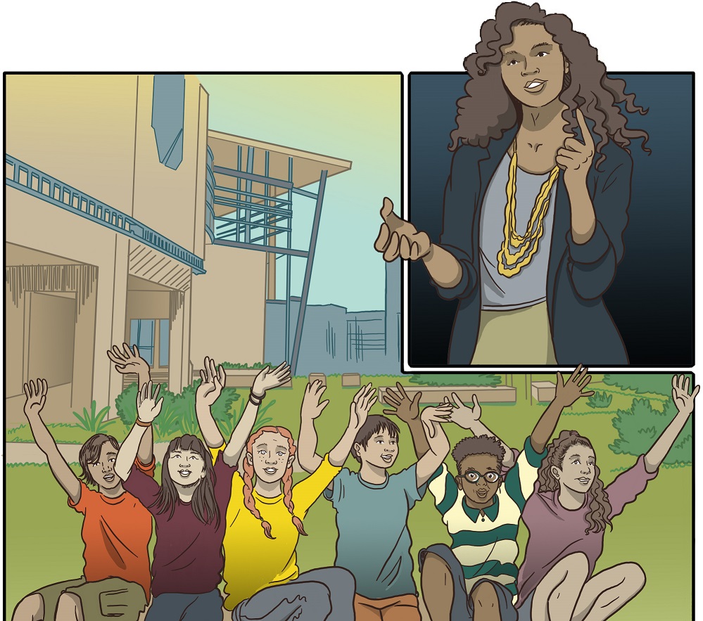 The whole graphic novel is set 100 years in the future and imagines a world where humanity has solved the climate crisis. It hints at how we’ll get there, by acting together on changes that are quite achievable.